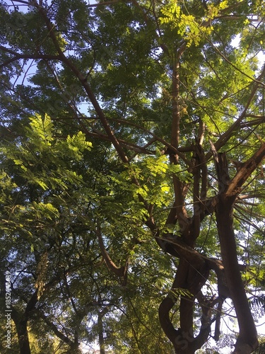 Fototapeta premium Looking up into a lush neem tree canopy, where dense green leaves weave...