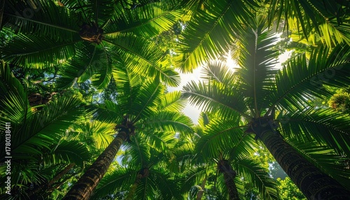 © chikaa, Fototapeta premium Looking Up Through Lush Green Palm Tree Canopy Sunlight Filters Through Tropical Forest Leaves