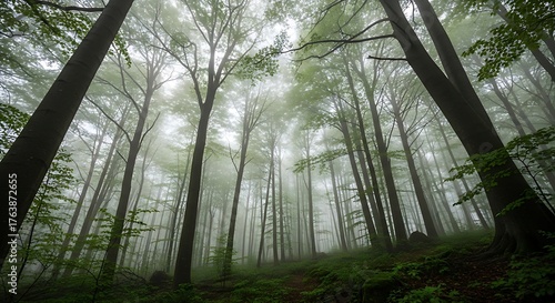 © Atizaz , Fototapeta premium Looking up through tall trees in a misty green forest canopy on a foggy day