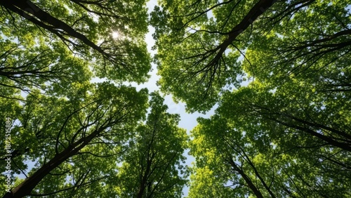 © Mahdi, Obraz premium Looking up through the lush green forest canopy towards the bright sky