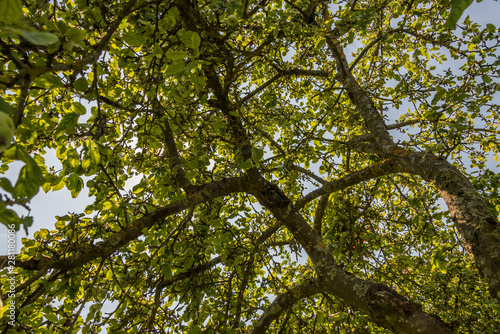 Obraz premium Looking up to the Sky through Apple Tree Branches with Apples