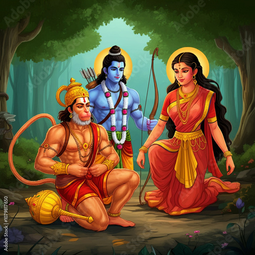 © Deepa, Fototapeta premium Lord Rama and Sita seated in a forest with Lord Hanuman kneeling in reverence, symbolizing devotion, loyalty, and divine love