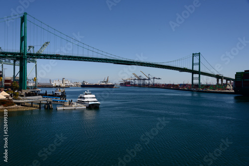 Naklejka premium Los Angeles, port of San Pedro. Vincent Thomas bridge. Container cranes in the background