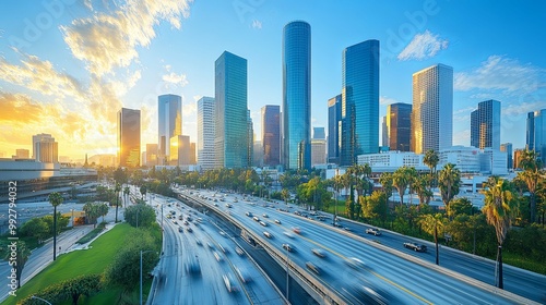 © BRAJA, Fototapeta premium Los Angeles Skyline with Freeway Traffic at Sunset