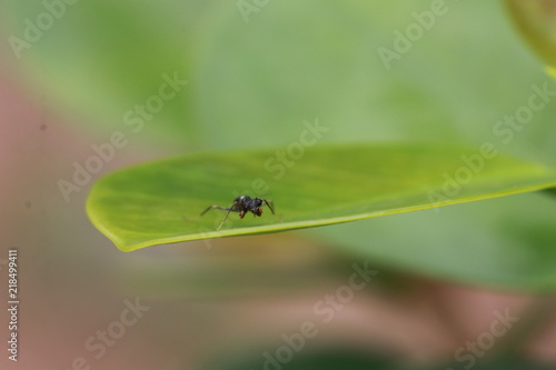 © panom, Fototapeta premium lose up small black mantis on green leaf