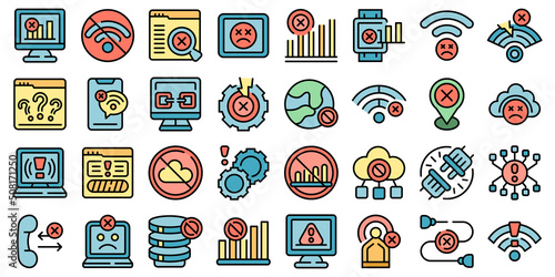 Fototapeta premium Lost connection icons set outline vector. Atenna available. Signal cell thin line color flat on white