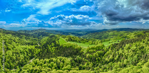 © rogozinski, Fototapeta premium Lot nad Wierchomlą Małą wiosną. Bacówka nad Wierchomlą i okolice.