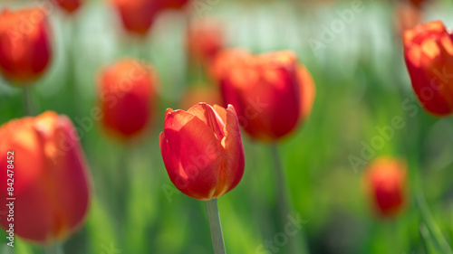 © iloli, Obraz premium lots of beautiful red tulips, spring natural background