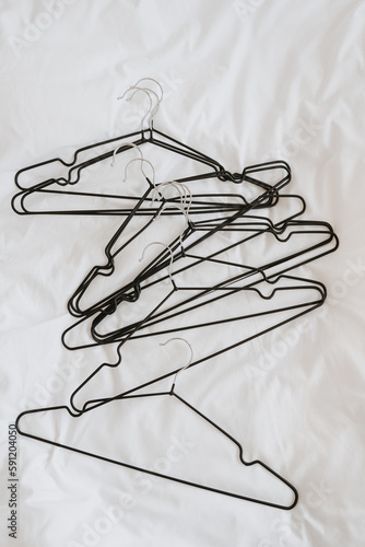 © Floral Deco, Fototapeta premium Lots of hangers on white linen cloth. Minimalist fashion, wardrobe, clothes concept. Flat lay, top view