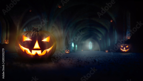 Naklejka premium Lots of Jack O' Lanterns in the dark blue spooky ruins of an old church,...