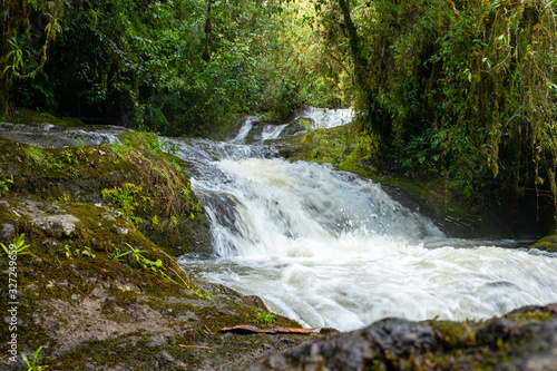 Naklejka premium Lots of Vegetation, Plants, Moss on the Rocks at Waterfalls near to the Splendors Cave in Antioquia, Colombia