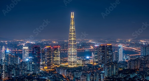 © Shibly Sadik, Obraz premium Lotte world tower at night, a modern skyscraper in seouls illuminated cityscape