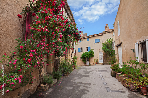 © ermess, Naklejka premium Lourmarin, Vaucluse, Provence, France: picturesque old alley in the ancient village with plants and red roses