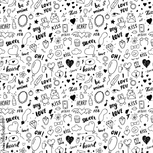 © saint_antonio, Fototapeta premium Love and Valentine Day seamless pattern vector illustration. Hand drawn sketched doodle romantic symbols background