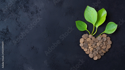 © pattozher, Naklejka premium Love for nature: A symbol of growth and environmental commitment, a young plant emerges from a heart-shaped arrangement of stones, set against a textured, dark background.