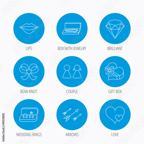 Fototapeta premium Love heart, gift box and wedding rings icons.