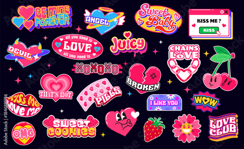 Obraz premium Love heart y2k retro groovy stickers, Valentine Day patch labels. Vector pink...