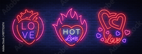 © Ivan, Fototapeta premium Love is a set of symbols. Collection of neon signs on the theme of Valentine s Day. Flaming banner for greetings, leaflet, flyer. Bright night neon advertisement for the day of lovers. Vector