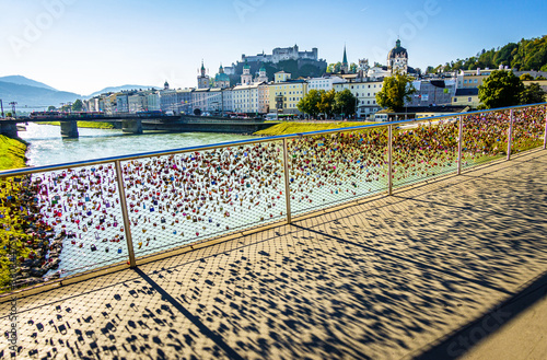 © fottoo, Obraz premium love padlocks at a bridge in the famous old town of Salzburg in Austria