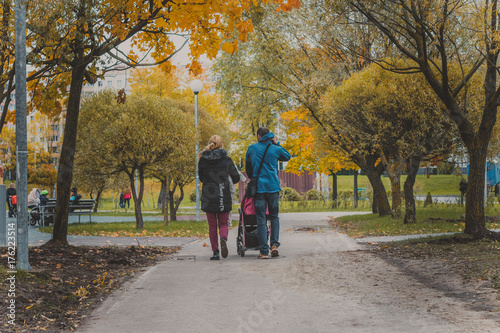 © t_Nt, Fototapeta premium love, parenthood, family, season and people concept - smiling couple with baby pram in autumn park