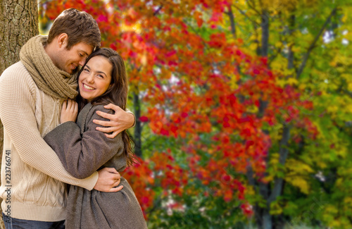 Fototapeta premium love, relationship and season concept - smiling couple hugging over autumn...