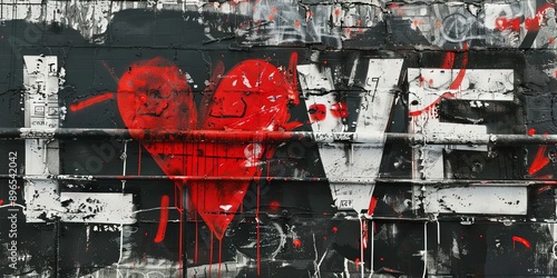 Naklejka premium "LOVE" text written in bold red, black, and white street art mural style