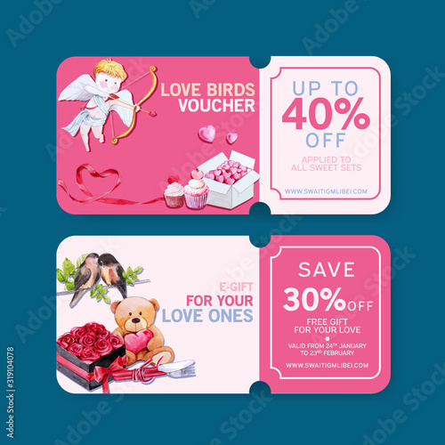 © photographeeasia, Obraz premium Love voucher design with cupid, teddy bear watercolor illustration.