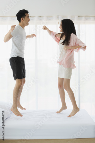 Fototapeta premium Lovely Asian couple jumping on bed in bedroom..