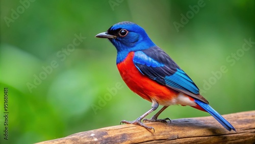 © Udomner, Fototapeta premium Lovely blue bird with black and red bills perching on wooden branch over clean green background , blue bird