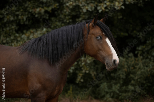 Fototapeta premium Lovely brown horse with blue eyes and white sign and black mane portrait on...