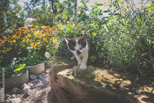 © katarinagondova, Fototapeta premium lovely cat in sunny day posing among green plants and colorful flowers