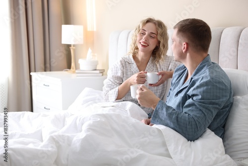 Obraz premium Lovely couple enjoying hot drinks in bed at home