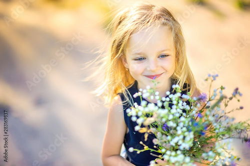 © Tortuga, Fototapeta premium lovely cute little girl with blond hair walks outdoors at sunset, holds a bouquet of wildflowers in her hands, happy childhood