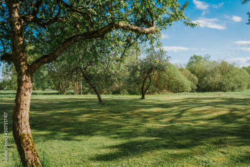 © Lauris Aizupietis, Fototapeta premium Lovely evening in the apple tree garden