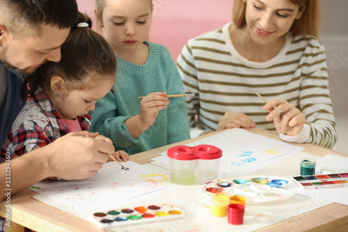 Fototapeta premium Lovely family painting at table indoors. Playing with children