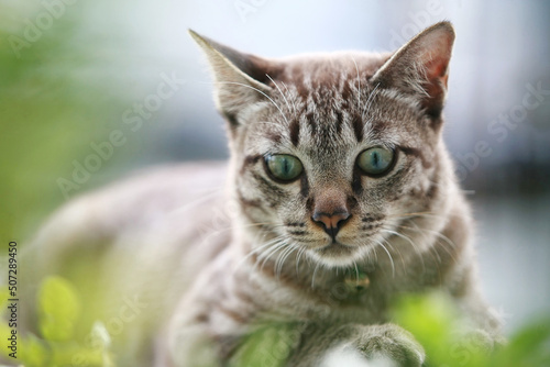 © Khemmanat, Fototapeta premium Lovely gray cat sitting at outdoor
