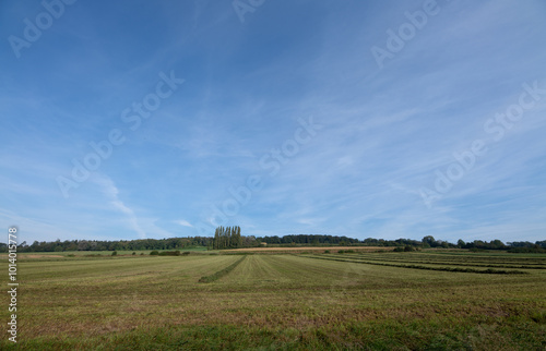 © leopictures, Obraz premium Lovely landscape with a gentle hill with a few cornifers growing on the horizon. The sky is blue and covered with clouds. Bare fields in the foreground.