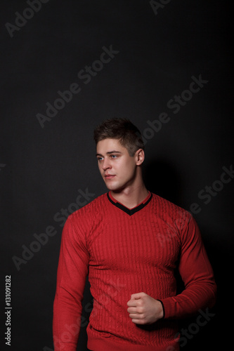 © nazarets, Naklejka premium Lovely man standing on a black background. Very handsome man dressed in a red sweater.
