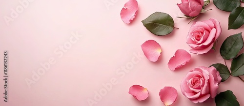 © vxnaghiyev, Fototapeta premium Lovely roses on a light pink background top view Area for text. with copy space image. Place for adding text or design