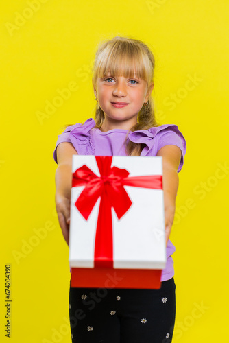 Fototapeta premium Lovely smiling preteen child girl kid presenting birthday gift box stretches out hands, offer wrapped present career bonus, celebrating party. Little children on studio yellow background. Vertical