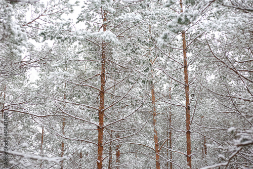 Obraz premium Lovely winter forest landscape view with pine trees covered with freshly...