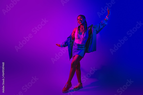 Fototapeta premium Lovely woman dancing in vibrant neon lights, wearing denim jacket and skirt,...