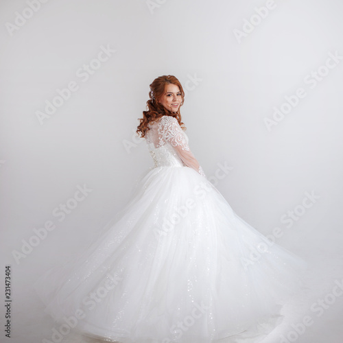 Fototapeta premium Lovely young woman bride in a lavish wedding dress. Light background.
