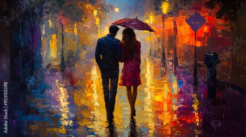 Obraz premium Lovers in the rain, walking through a glowing city street, reflections shimmering on the wet ground, oil painting, soft yet vivid colors, delicate brushwork, romantic vibe