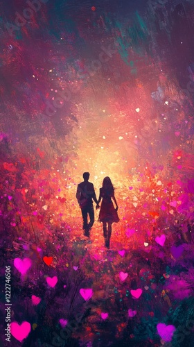 Fototapeta premium Lovers walking amidst a field of glowing heart-shaped flowers, bold oil-paint...