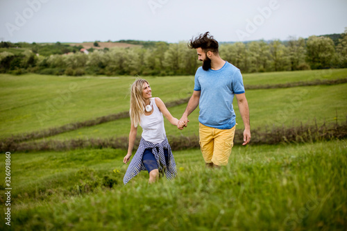 Fototapeta premium Loving couple enjoying a walk through grass land