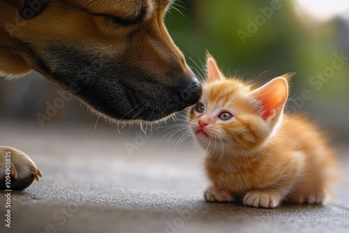 Obraz premium Loving dog nose touches ginger kitten on sunny day.
