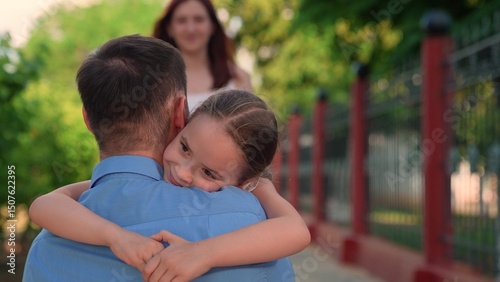 Fototapeta premium Loving father tenderly embraces his daughter in summer park day outdoor. Happy family closeup, dad hugs his child girl on walk in city park with green trees. Happy childhood, happy family kid girl mom