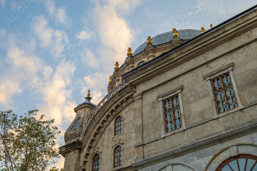 Fototapeta premium Low-angle close-up of a historic Nusretiye mosque's stone facade and gilded...