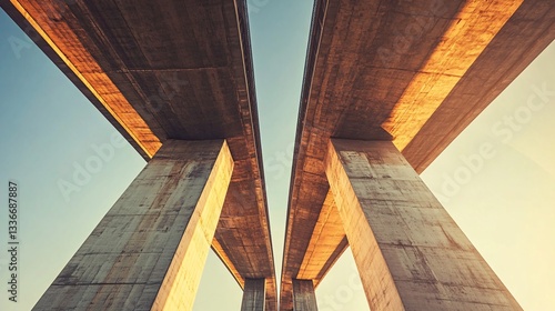 © ichzigo, Fototapeta premium Low-Angle Close-Up of Symmetrical Concrete Support Pillars of a Modern Bridge Against a Clear Sky